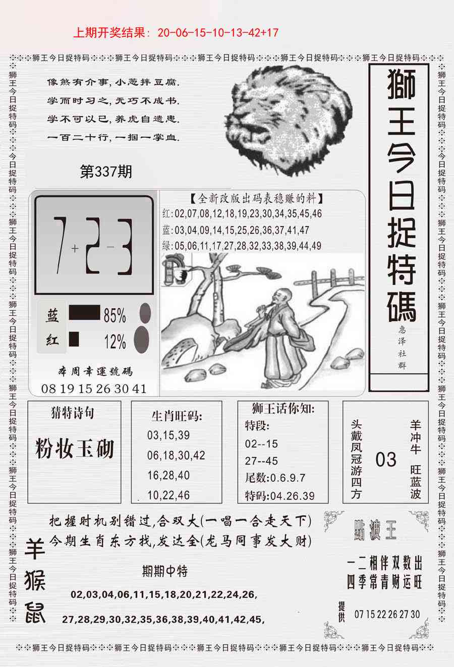 337期: 澳门六合皇彩圖信封【狮王平特】每期自动更新